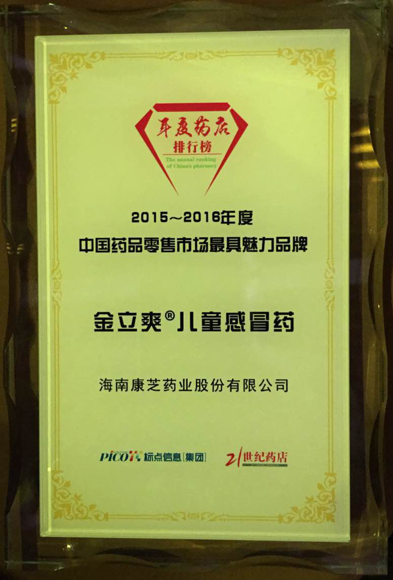 11月24日晚,由CFDA南方醫(yī)藥經(jīng)濟(jì)研究所指導(dǎo)、《21世紀(jì)藥店》舉辦的2015-2016年度中國藥品零售市場品牌評選活動在廣州白云國際會議中心揭曉結(jié)果。918博天堂旗下金立爽?兒童感冒藥在眾多品牌中脫穎而出,榮獲“2015-2016年度中國藥品零售市場最具魅力品牌”稱號。