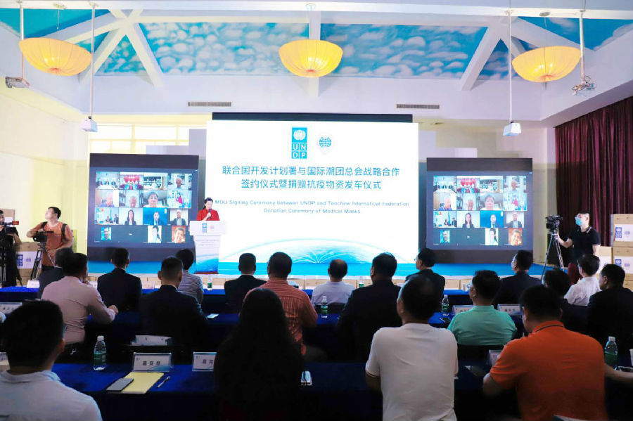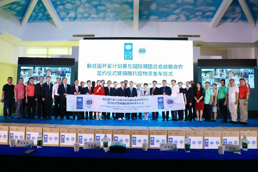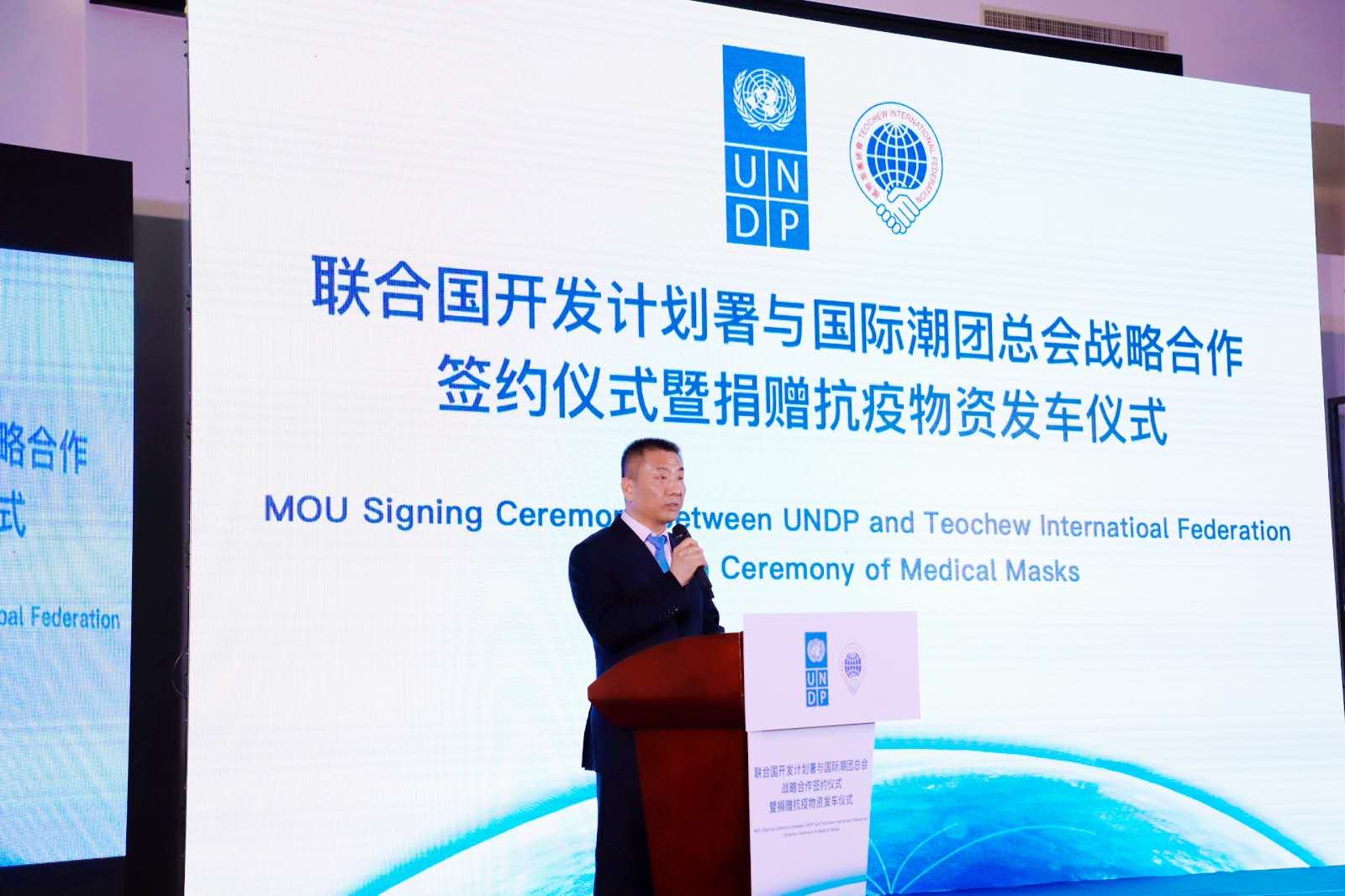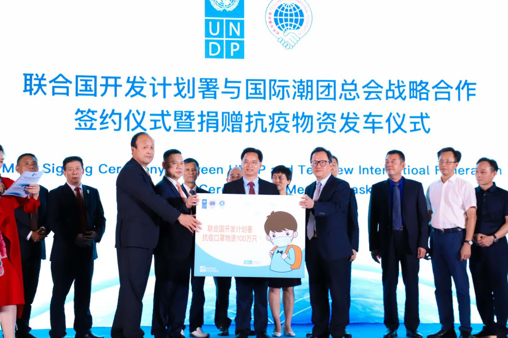 除捐贈(zèng)抗疫物資發(fā)車(chē)儀式外,活動(dòng)中,國(guó)際潮團(tuán)總會(huì)主席洪江游、執(zhí)行主席陳幼南博士代表國(guó)際潮團(tuán)總會(huì)簽署了與聯(lián)合國(guó)開(kāi)發(fā)計(jì)劃署的合作備忘錄,雙方正式建立戰(zhàn)略合作伙伴關(guān)系。