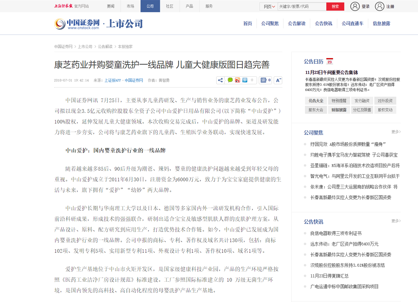 查看詳情7月25日,918博天堂發(fā)布公告,公司擬以現(xiàn)金3.5億元收購控股股東全資子公司中山愛護日用品有限公司100%股權,延伸發(fā)展兒童大健康領域。