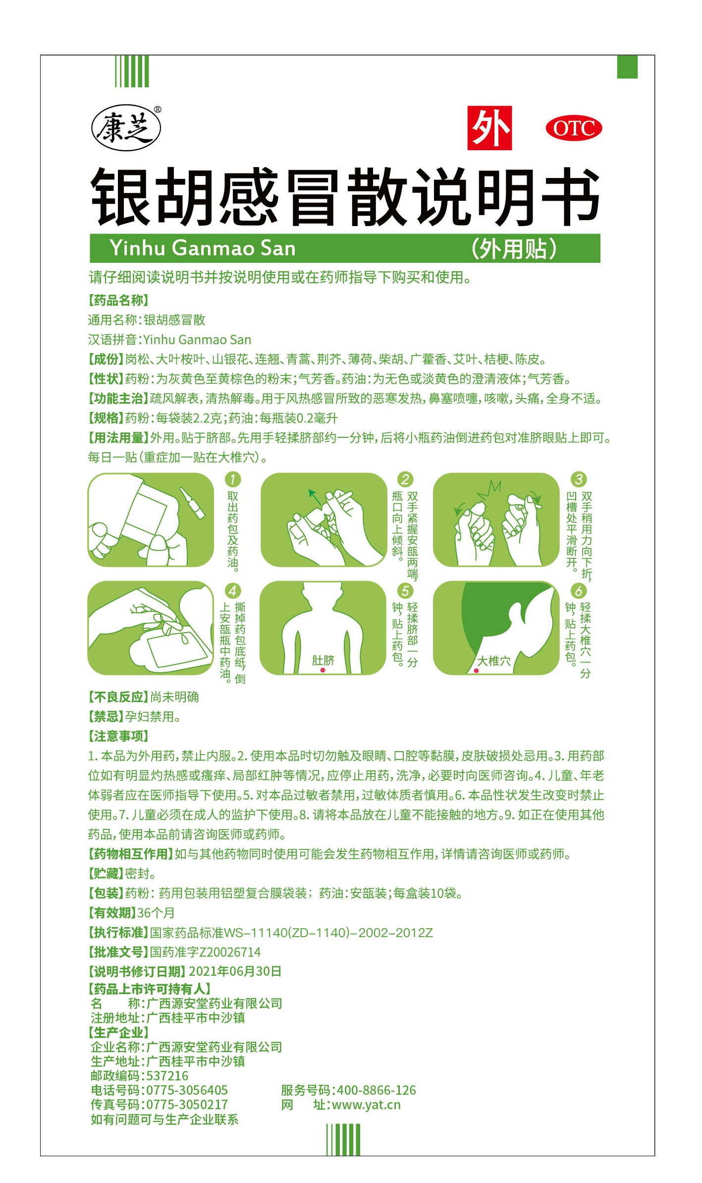 1、 2貼;3貼;5貼;10貼; 2、銀胡感冒散研制于1996年源安堂藥業(yè),其組方出自《溫病條辨》—“銀翹散”基礎上加減,并巧妙加入壯醫(yī)特色藥材崗松、大葉桉葉、青蒿、荊芥等富含揮發(fā)油藥材,通過獨特制備工藝將揮發(fā)油精制成藥油,形成創(chuàng)新藥粉+藥油混合的給藥方式,制成屬于散劑的外用貼,在治療感冒發(fā)燒領域獨樹一幟,開創(chuàng)先河。