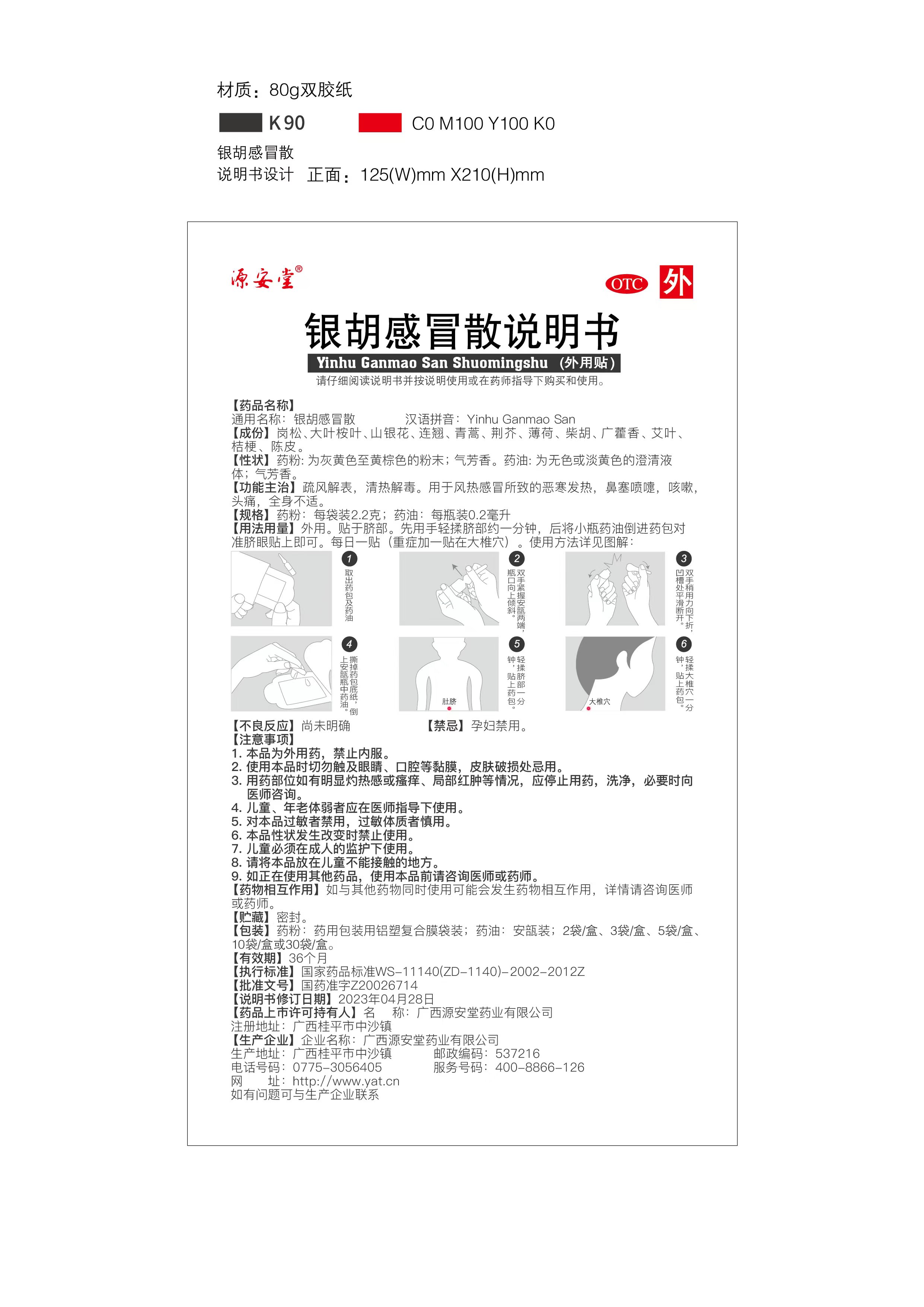 1、 30貼; 2、銀胡感冒散研制于1996年源安堂藥業(yè),其組方出自《溫病條辨》—“銀翹散”基礎(chǔ)上加減,并巧妙加入壯醫(yī)特色藥材崗松、大葉桉葉、青蒿、荊芥等富含揮發(fā)油藥材,通過獨(dú)特制備工藝將揮發(fā)油精制成藥油,形成創(chuàng)新藥粉+藥油混合的給藥方式,制成屬于散劑的外用貼,在治療感冒發(fā)燒領(lǐng)域獨(dú)樹一幟,開創(chuàng)先河